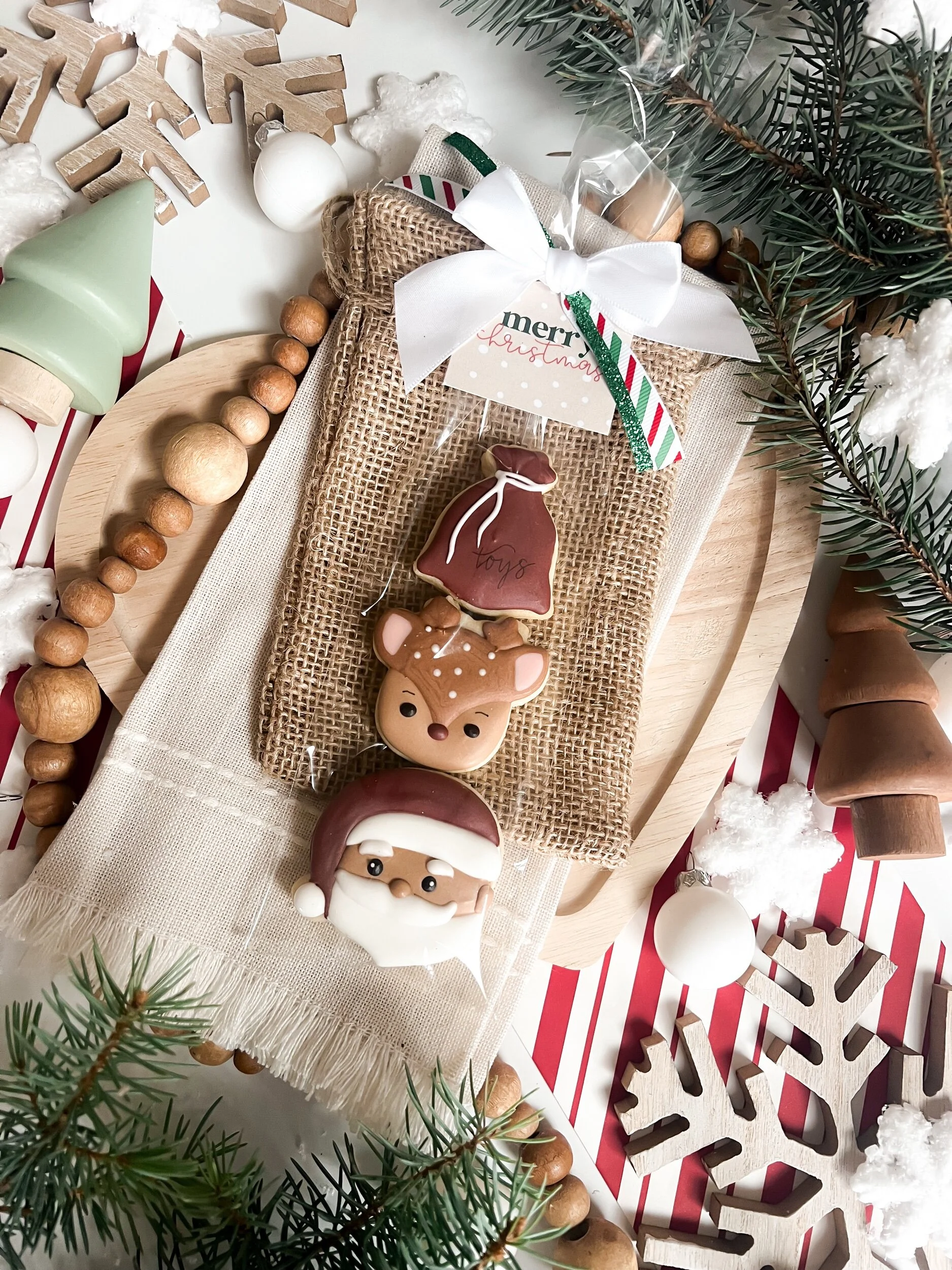 Christmas Pre-Sale › 3pc Mini Santa Set Image 1 of 1 3pc Mini Santa Set $7.50 3 cookies, 2 inches on longest side- vanilla sugar cookie with vanilla royal icingHeat sealed and tied with bow Pickup Date: 12/19 12/22 Quantity: Add To Cart Added! 3 cookies, 2 inches on longest side- vanilla sugar cookie with vanilla royal icingHeat sealed and tied with bow