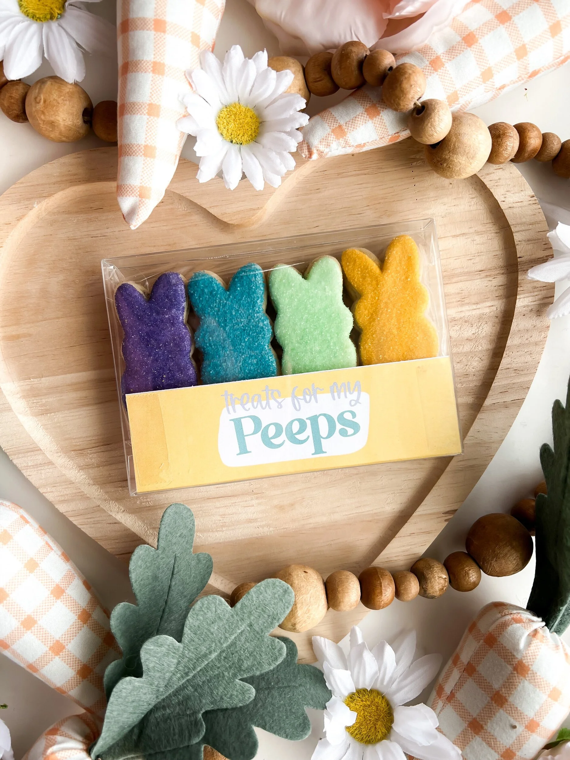 Mini Peep Cookies, Vanilla Sugar Cookies with Vanilla Royal Icing. Heat Sealed in Single Bag and placed in box. *Cookies are covered with sanding sugar on the top*