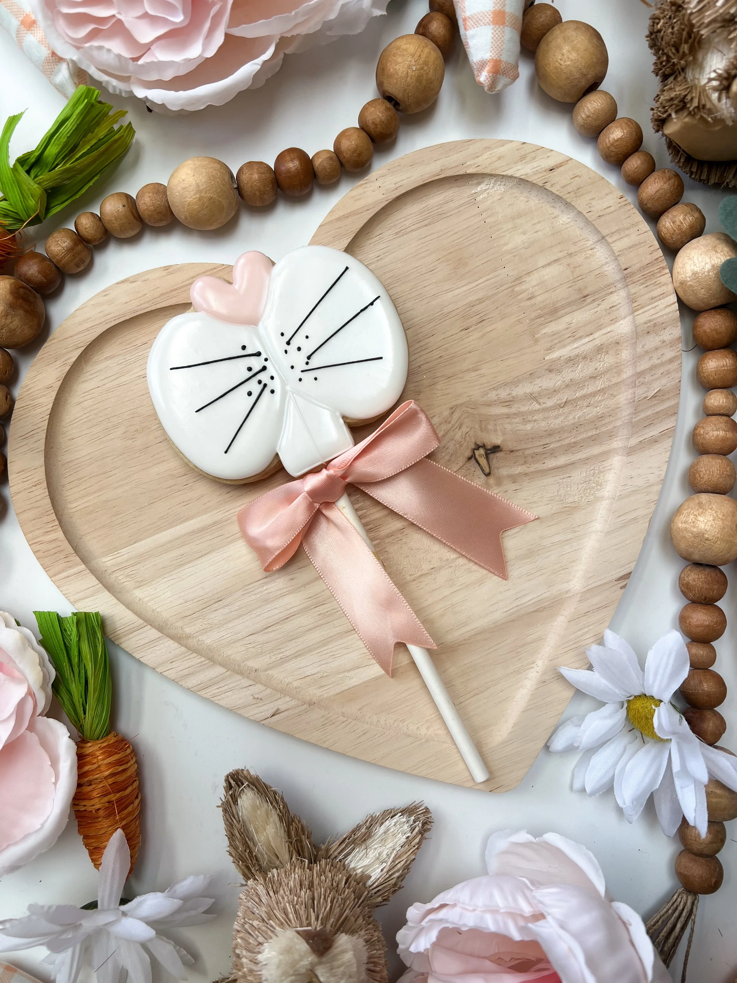 Easter Pre-Sale › Bunny Face Cookie Image 1 of 1 Bunny Face Cookie $6.00 Vanilla Sugar Cookie with Vanilla Royal Icing 3-3.5 inches on longest side. On stick tied with bow Pickup Date: 4/3 4/2 4/4 Add To Cart Added! Vanilla Sugar Cookie with Vanilla Royal Icing 3-3.5 inches on longest side. On stick tied with bow