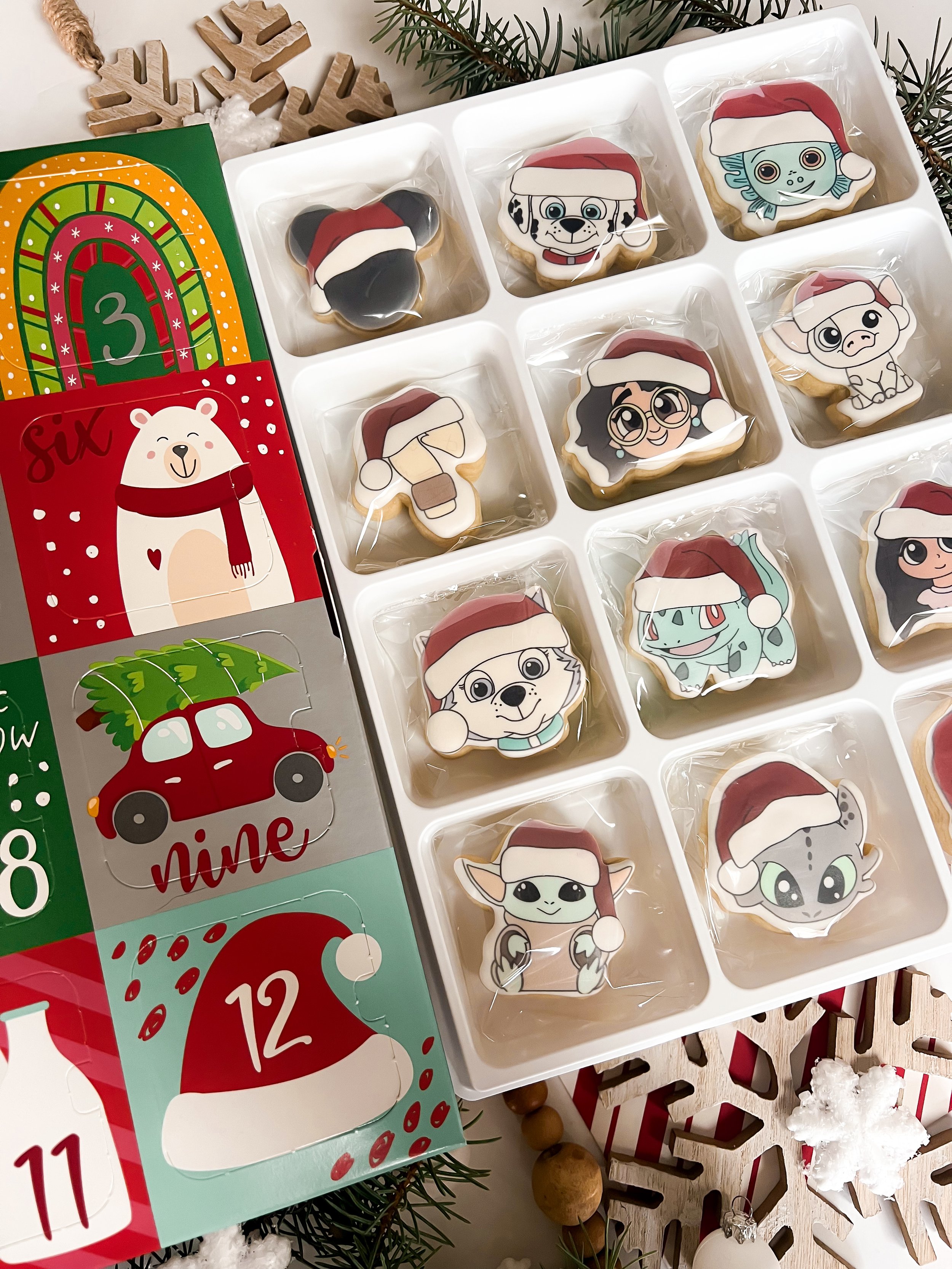 24 door advent calendar, all cookies are minis at 2-2.4 inches on longest side
